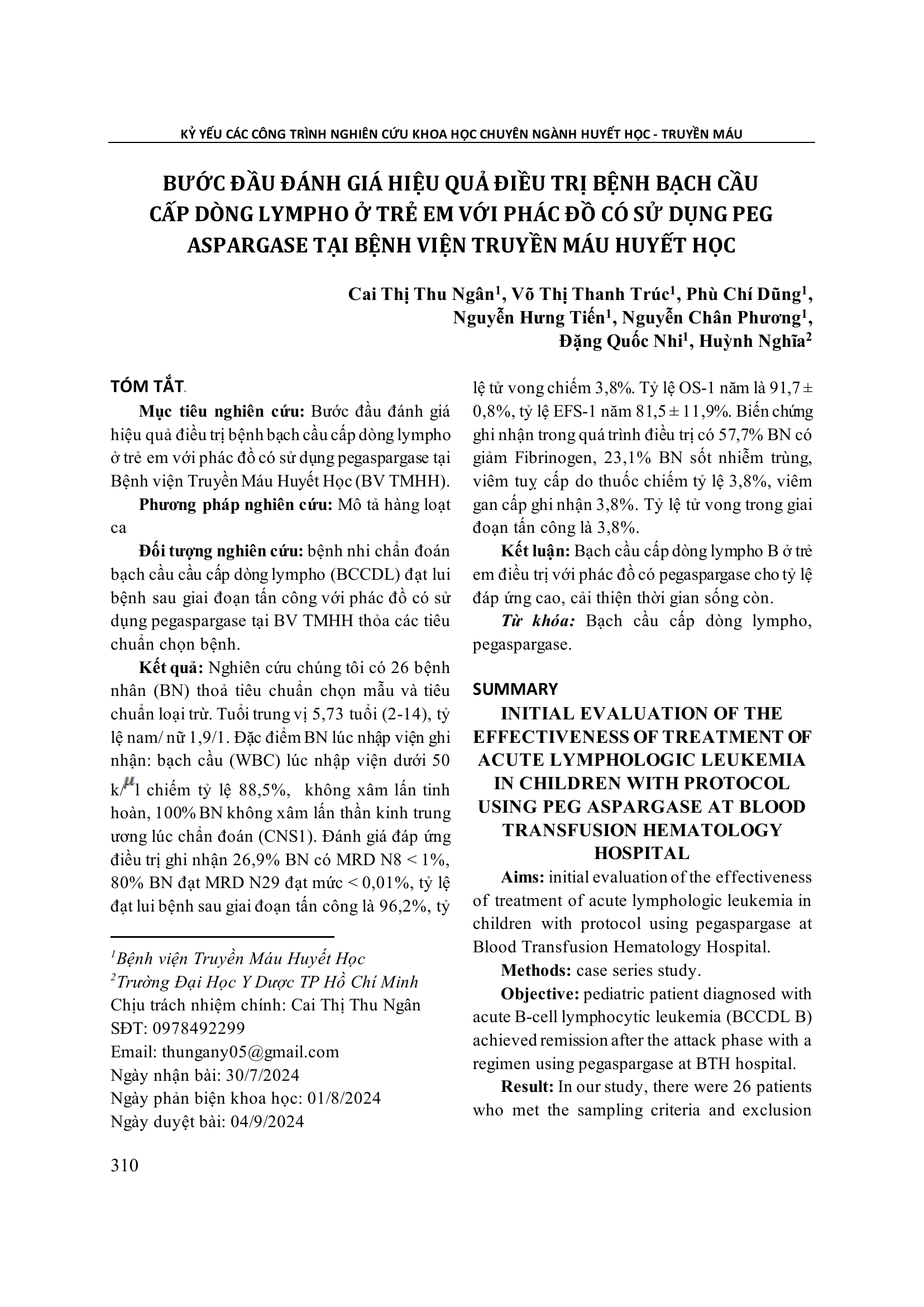 Bước đầu đánh giá hiệu quả điều trị bệnh bạch cầu cấp dòng lympho ở trẻ em với phác đồ có sử dụng pegaspargase tại Bệnh viện Truyền Máu Huyết Học (BV TMHH).
