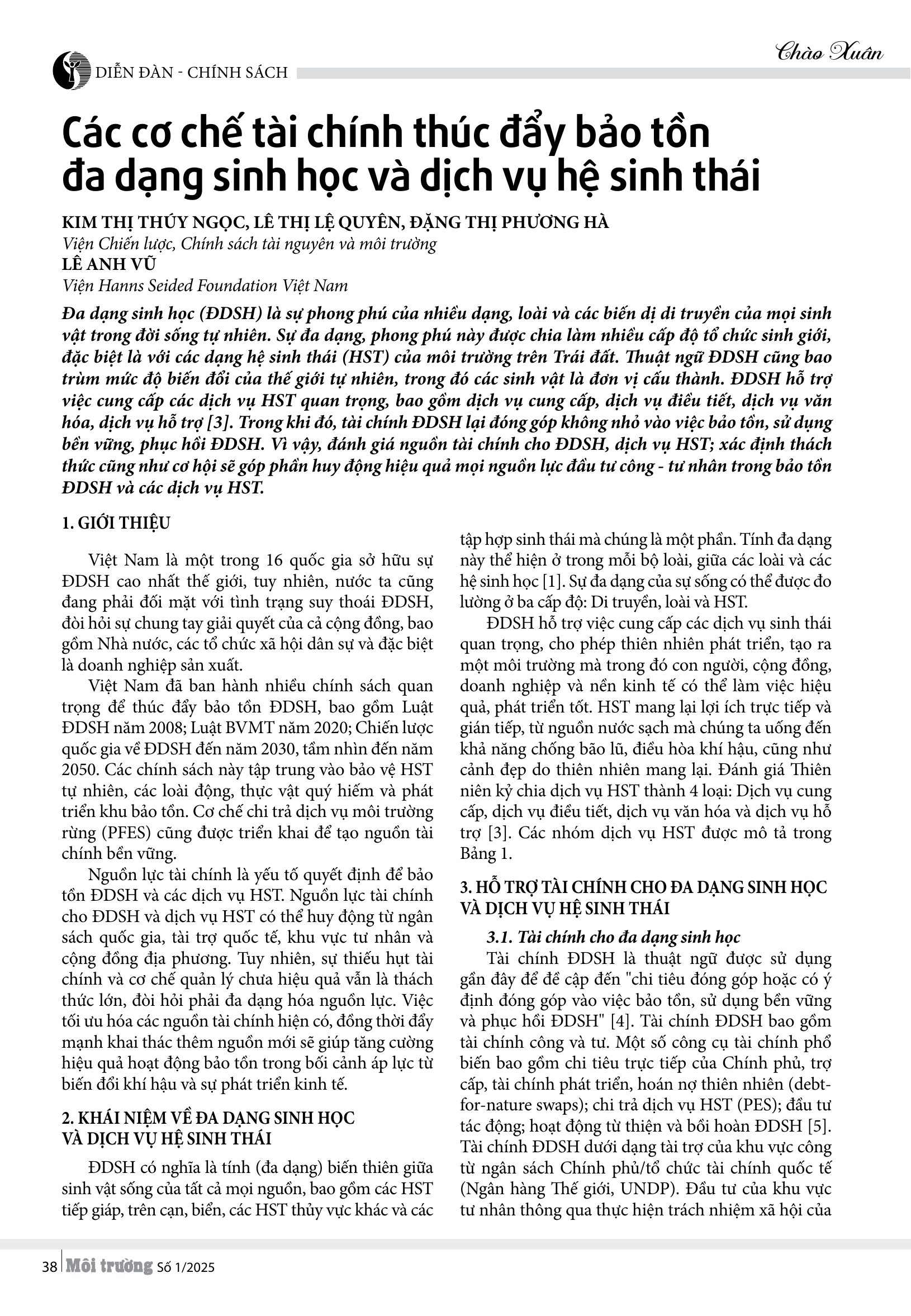 Sự đa dạng, phong phú này được chia làm nhiều cấp độ tổ chức sinh giới đặc biệt là với các dạng hệ sinh thái (HST) của môi trường trên Trái đất. Thuật ngữ ĐDSH cũng bao trùm mức độ biến đổi của thế giới tự nhiên, trong đó các sinh vật là đơn vị cấu thành. ĐDSH hỗ trợ việc cung cấp các dịch vụ HST quan trọng, bao gồm dịch vụ cung cấp, dịch vụ điều tiết, dịch vụ văn hóa, dịch vụ hỗ trợ [3]. Trong khi đó, tài chính ĐDSH lại đóng góp không nhỏ vào việc bảo tồn, sử dụng bền vững, phục hồi ĐDSH. Vì vậy, đánh giá nguồn tài chính cho ĐDSH, dịch vụ HST; xác định thách thức cũng như cơ hội sẽ góp phần huy động hiệu quả mọi nguồn lực đầu tư công - tư nhân trong bảo tồn ĐDSH và các dịch vụ HST.