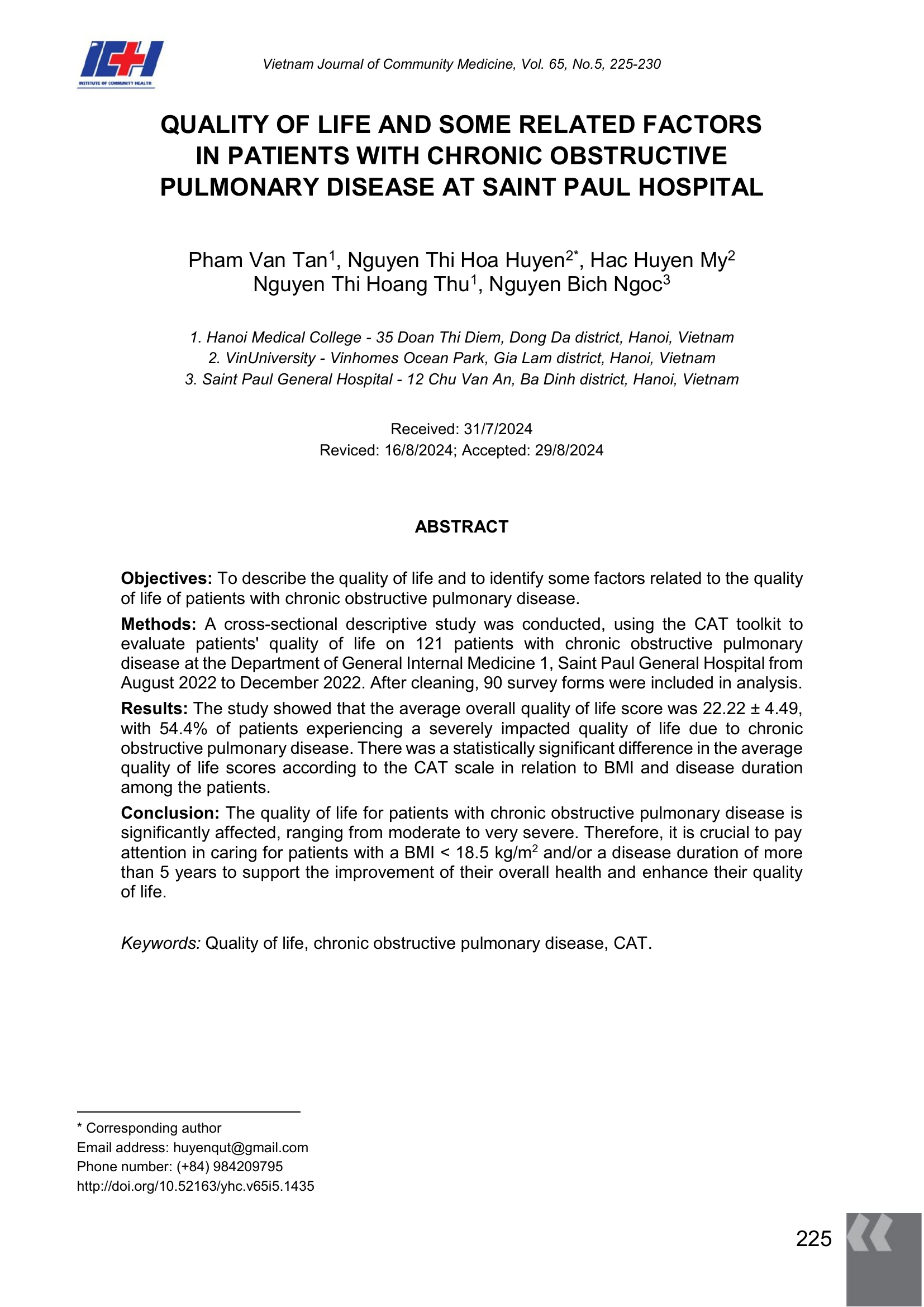 Chất lượng cuộc sống và một số yếu tố liên quan ở người bệnh mắc bệnh phổi tắc nghẽn mạn tính tại Bệnh viện Đa khoa Xanh Pôn