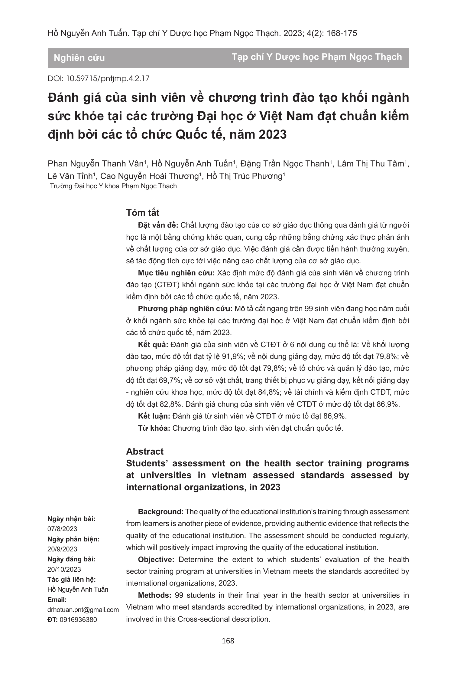 Việc đánh giá cần được tiến hành thường xuyên, sẽ tác động tích cực tới việc nâng cao chất lượng của cơ sở giáo dục. - Mục tiêu nghiên cứu: Xác định mức độ đánh giá của sinh viên về chương trình đào tạo (CTĐT) khối ngành sức khỏe tại các trường đại học ở Việt Nam đạt chuẩn kiểm định bởi các tổ chức quốc tế, năm 2023.- Phương pháp nghiên cứu: Mô tả cắt ngang trên 99 sinh viên đang học năm cuối ở khối ngành sức khỏe tại các trường đại học ở Việt Nam đạt chuẩn kiểm định bởi các tổ chức quốc tế, năm 2023.- Kết quả: Đánh giá của sinh viên về CTĐT ở 6 nội dung cụ thể là: Về khối lượng đào tạo, mức độ tốt đạt tỷ lệ 91,9%; về nội dung giảng dạy, mức độ tốt đạt 79,8%; về phương pháp giảng dạy, mức độ tốt đạt 79,8%; về tổ chức và quản lý đào tạo, mức độ tốt đạt 69,7%; về cơ sở vật chất, trang thiết bị phục vụ giảng dạy, kết nối giảng dạy - nghiên cứu khoa học, mức độ tốt đạt 84,8%; về tài chính và kiểm định CTĐT, mức độ tốt đạt 82,8%. Đánh giá chung của sinh viên về CTĐT ở mức độ tốt đạt 86,9%. - Kết luận: Đánh giá từ sinh viên về CTĐT ở mức tốt đạt 86,9%.Abstract - Background: The quality of the educational institution’s training through assessment from learners is another piece of evidence, providing authentic evidence that reflects the quality of the educational institution. The assessment should be conducted regularly, which will positively impact improving the quality of the educational institution.- Objective: Determine the extent to which students’ evaluation of the health sector training program at universities in Vietnam meets the standards accredited by international organizations, 2023.- Methods: 99 students in their final year in the health sector at universities in Vietnam who meet standards accredited by international organizations, in 2023, are involved in this Cross-sectional description.- Results: Students’ evaluation of the education program in 6 specific contents: In terms of training volume, the good level reached 91.9%; in terms of teaching content, the good level reached 79.8%; in terms of teaching methods, the good level reached 79.8%; on training organization and management, the good level reached 69.7%; in terms of facilities, equipment for teaching, connection of teaching - scientific research, the good level reached 84.8%; in finance and training program accreditation, the good level reached 82.8%. The overall assessment of students about the training program is at the proficient level of 86.9%.- Conclusion: Evaluation from students about the training program was at a factor of 86.9%. DOI: 10.59715/pntjmp.2.4.17