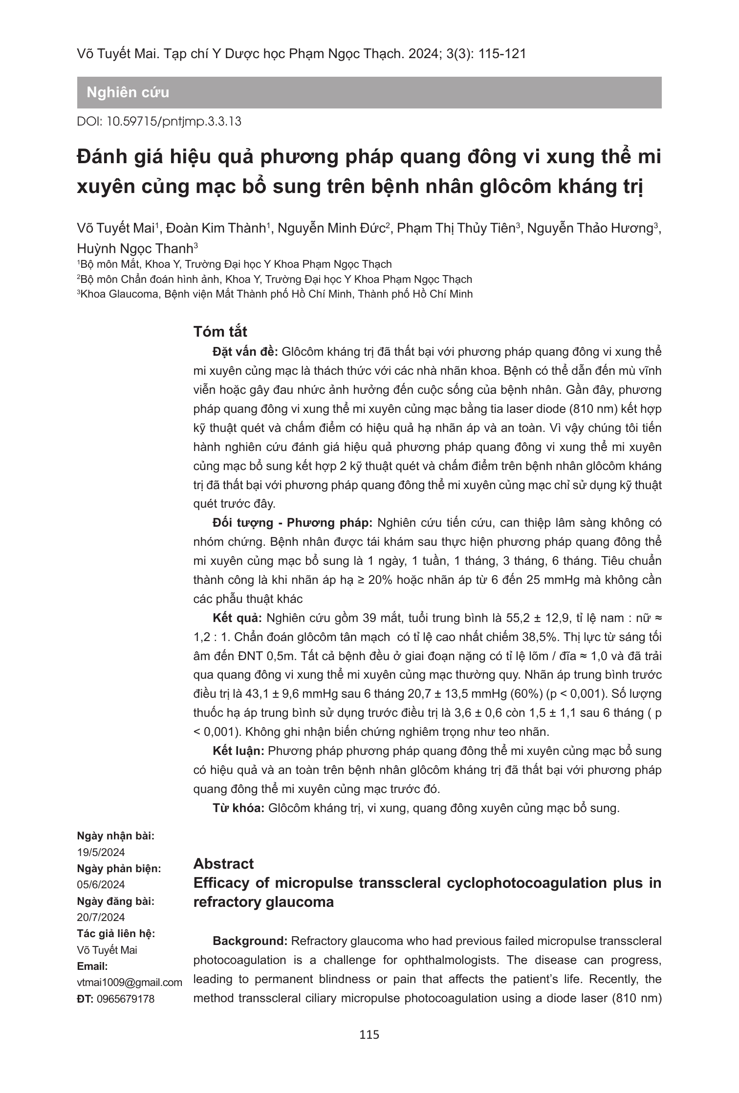 Bệnh có thể dẫn đến mù vĩnh viễn hoặc gây đau nhức ảnh hưởng đến cuộc sống của bệnh nhân. Gần đây, phương pháp quang đông vi xung thể mi xuyên củng mạc bằng tia laser diode (810 nm) kết hợp kỹ thuật quét và chấm điểm có hiệu quả hạ nhãn áp và an toàn. Vì vậy chúng tôi tiến hành nghiên cứu đánh giá hiệu quả phương pháp quang đông vi xung thể mi xuyên củng mạc bổ sung kết hợp 2 kỹ thuật quét và chấm điểm trên bệnh nhân glôcôm kháng trị đã thất bại với phương pháp quang đông thể mi xuyên củng mạc chỉ sử dụng kỹ thuật quét trước đây. Đối tượng - Phương pháp: Nghiên cứu tiến cứu, can thiệp lâm sàng không có nhóm chứng. Bệnh nhân được tái khám sau thực hiện phương pháp quang đông thể mi xuyên củng mạc bổ sung là 1 ngày, 1 tuần, 1 tháng, 3 tháng, 6 tháng. Tiêu chuẩn thành công là khi nhãn áp hạ ≥ 20% hoặc nhãn áp từ 6 đến 25 mmHg mà không cần các phẫu thuật khác. Kết quả: Nghiên cứu gồm 39 mắt, tuổi trung bình là 55,2 ± 12,9, tỉ lệ nam : nữ ≈ 1,2 : 1. Chẩn đoán glôcôm tân mạch có tỉ lệ cao nhất chiếm 38,5%. Thị lực từ sáng tối âm đến ĐNT 0,5m. Tất cả bệnh đều ở giai đoạn nặng có tỉ lệ lõm / đĩa ≈ 1,0 và đã trải qua quang đông vi xung thể mi xuyên củng mạc thường quy. Nhãn áp trung bình trước điều trị là 43,1 ± 9,6 mmHg sau 6 tháng 20,7 ± 13,5 mmHg (60%) (p < 0,001). Số lượng thuốc hạ áp trung bình sử dụng trước điều trị là 3,6 ± 0,6 còn 1,5 ± 1,1 sau 6 tháng (p < 0,001). Không ghi nhận biến chứng nghiêm trọng như teo nhãn. Kết luận: Phương pháp phương pháp quang đông thể mi xuyên củng mạc bổ sung có hiệu quả và an toàn trên bệnh nhân glôcôm kháng trị đã thất bại với phương pháp quang đông thể mi xuyên củng mạc trước đó. Abstract Background: Refractory glaucoma who had previous failed micropulse transscleral photocoagulation is a challenge for ophthalmologists. The disease can progress, leading to permanent blindness or pain that affects the patient’s life. Recently, the method transscleral ciliary micropulse photocoagulation using a diode laser (810 nm) combining 2 techniques sweeping and discrete spot for intraocular pressure lowering and safety. Therefore, we conducted a survey of evaluating the efficacy of micropulse transscleral cyclophotocoagulation plus combining 2 techniques sweeping and discrete spot in treating refractory glaucoma who had previous failed micropulse transscleral photocoagulation with only performing techniques sweeping. Patient and methods: Prospective study involved with uncontrolled clinical trial. The main outcome measurement was IOP at 1day, 1 week, 1 month, 3 months, 6 months post-procedure, with success defined as a 20% reduction in baseline IOP or IOP from 6 to 25 mmHg, and no need for further reoperation. Results: The study included 39 eyes with refractory glaucoma, average age was 55.2 ± 12.9 years, ratio of male and female = 1,2 : 1 . The diagnosis of neovascular glaucoma accounted for the highest rate in the study group (38,5%). Visual acuity from no perception of light to count fingers 0,5 m. All diseases have CDR = 1.0. The average preoperatively IOP was 43,1 ± 9,6 mmHg and posttreatment 6 months were 20,7 ± 13,5 mmHg (60%)( p < 0,001). There was a reduction in glaucoma medications form 3,6 ± 0,6 preoperatively to 1,5 ± 1,1 at 6 months p < 0,001). There were no cases of serious complication as hypotony. Conclusions: Micropulse transscleral cyclophotocoagulation plus is effective and safety in lowering intraocular pressure in eyes with refractory glaucoma after previous failed micropulse transscleral photocoagulation. DOI: 10.59715/pntjmp.3.3.13
