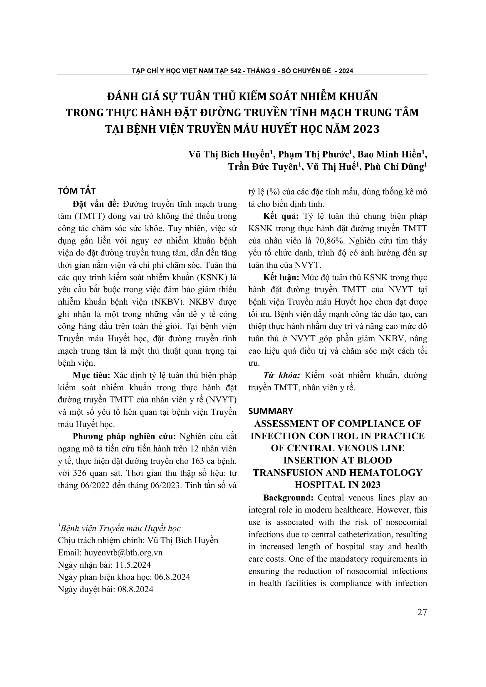 Đánh giá sự tuân thủ kiểm soát nhiễm khuẩn trong thực hành đặt đường truyền tĩnh mạch trung tâm tại Bệnh viện Truyền máu Huyết học năm 2023