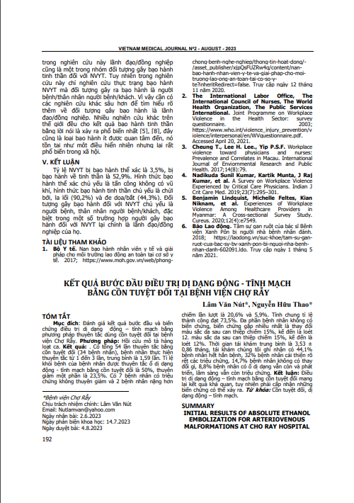 Đánh giá kết quả bước đầu và biến chứng điều trị dị dạng động – tĩnh mạch bằng phương pháp thuyên tắc dùng cồn tuyệt đối tại bệnh viện Chợ Rẫy. Phương pháp: Hồi cứu mô tả hàng loạt ca. Kết quả: . Có tổng 54 lần thuyên tắc bằng cồn tuyệt đối (34 bệnh nhân), bệnh nhân thực hiện thuyên tắc từ 1 đến 3 lần, trung bình là 1,59 lần. Tỉ lệ khỏi bệnh của bệnh nhân được thuyên tắc ổ dị dạng động - tĩnh mạch bằng cồn tuyệt đối là 50%, thuyên giảm một phần là 23,5%. Có 7 bệnh nhân có triệu chứng không thuyên giảm và 2 bệnh nhân nặng hơn chiếm lần lượt là 20,6% và 5,9%.