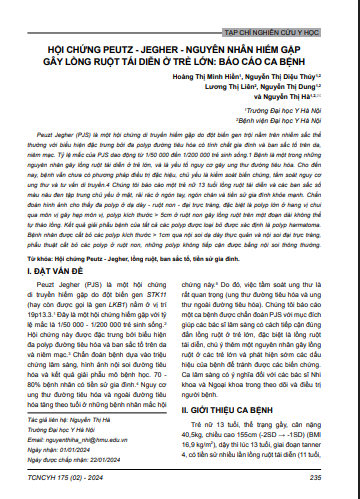 Tỷ lệ mắc của PJS dao động từ 1/50 000 đến 1/200 000 trẻ sinh sống.1 Bệnh là một trong những nguyên nhân gây lồng ruột tái diễn ở trẻ lớn, và là yếu tố nguy cơ gây ung thư đường tiêu hóa. Cho đến nay, bệnh vẫn chưa có phương pháp điều trị đặc hiệu, chủ yếu là kiểm soát biến chứng, tầm soát nguy cơ ung thư và tư vấn di truyền.4 Chúng tôi báo cáo một trẻ nữ 13 tuổi lồng ruột tái diễn và các ban sắc số màu nâu đen tập trung chủ yếu ở mặt, rải rác ở ngón tay, ngón chân và tiền sử gia đình khỏe mạnh. Chẩn đoán hình ảnh cho thấy đa polyp ở dạ dày - ruột non - đại trực tràng, đặc biệt là polyp lớn ở hang vị chui qua môn vị gây hẹp môn vị, polyp kích thước > 5cm ở ruột non gây lồng ruột trên một đoạn dài không thể tự tháo lồng. Kết quả giải phẫu bệnh của tất cả các polyp được loại bỏ được xác định là polyp harmatoma. Bệnh nhân được cắt bỏ các polyp kích thước > 1cm qua nội soi dạ dày thực quản và nội soi đại trực tràng, phẫu thuật cắt bỏ các polyp ở ruột non, những polyp không tiếp cận được bằng nội soi thông thường.