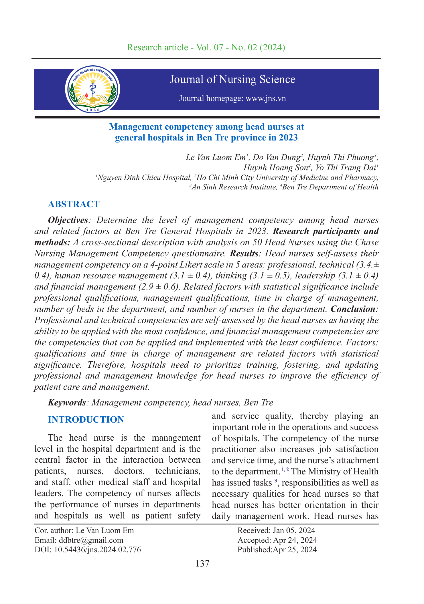 Objectives: Determine the level of management competency among head nurses and related factors at Ben Tre General Hospitals in 2023.