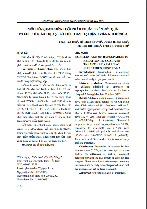 Mối liên quan giữa tuổi phẫu thuật trên kết quả và chi phí điều trị tật lỗ tiểu thấp tại Bệnh viện Nhi Đồng 2