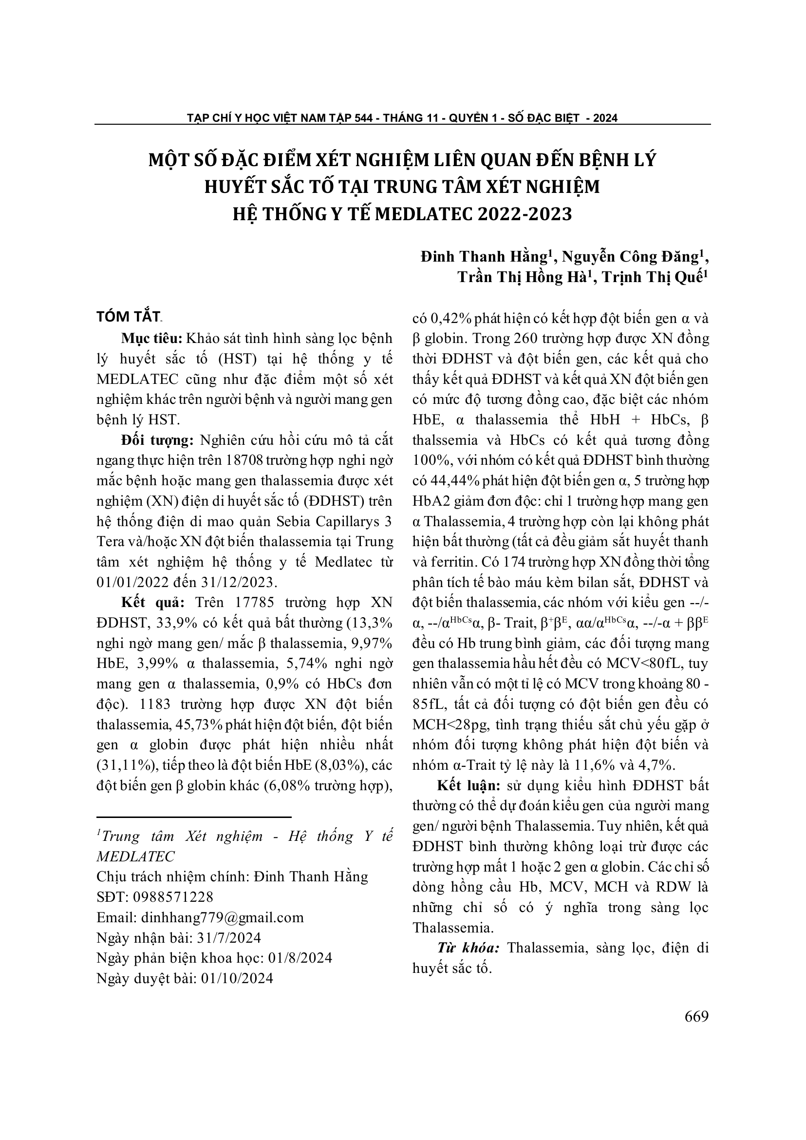 Khảo sát tình hình sàng lọc bệnh lý huyết sắc tố (HST) tại hệ thống y tế MEDLATEC cũng như đặc điểm một số xét nghiệm khác trên người bệnh và người mang gen bệnh lý HST.