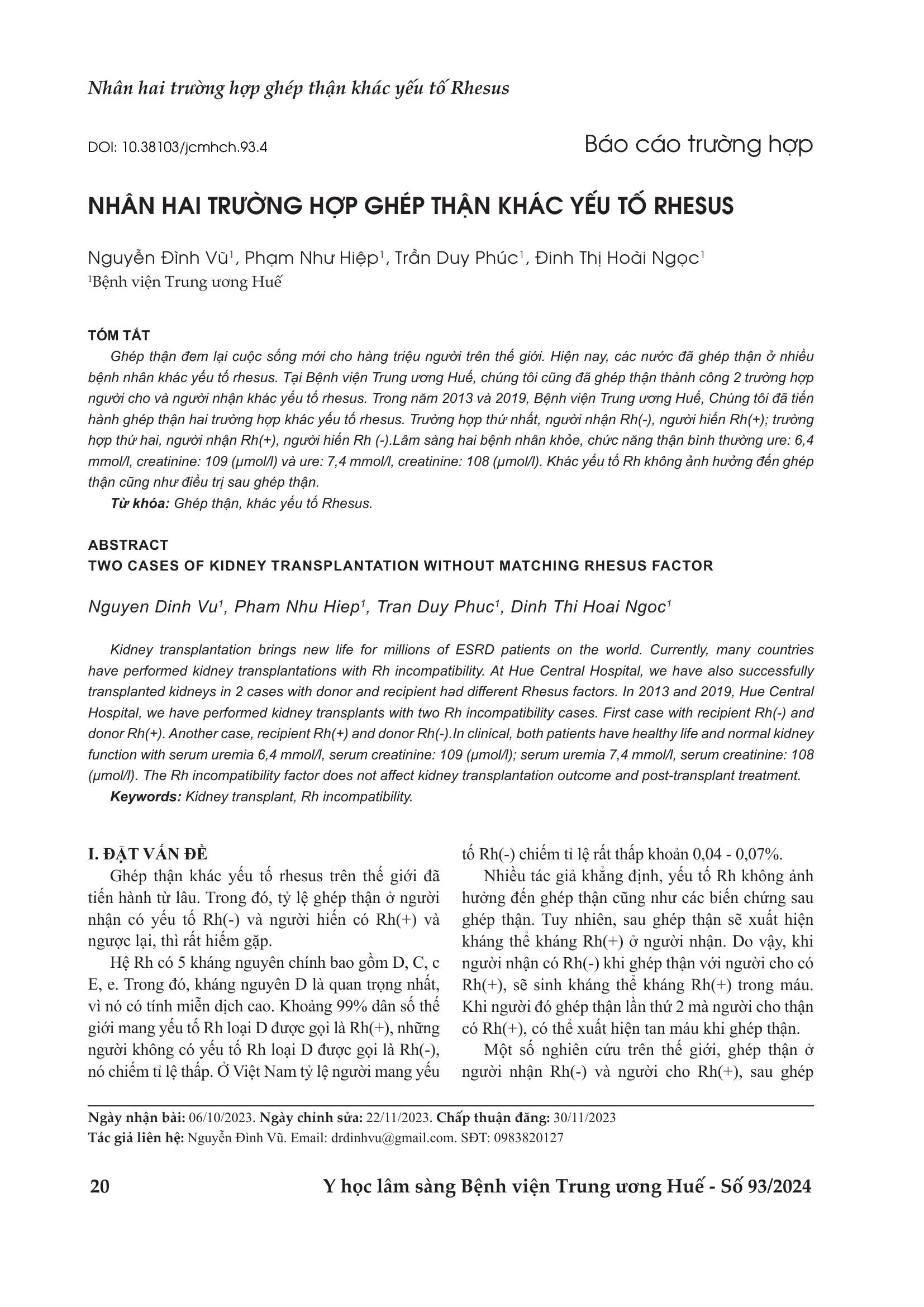 Hiện nay, các nước đã ghép thận ở nhiều bệnh nhân khác yếu tố rhesus. Tại Bệnh viện Trung ương Huế, chúng tôi cũng đã ghép thận thành công 2 trường hợp người cho và người nhận khác yếu tố rhesus. Trong năm 2013 và 2019, Bệnh viện Trung ương Huế, Chúng tôi đã tiến hành ghép thận hai trường hợp khác yếu tố rhesus. Trường hợp thứ nhất, người nhận Rh(-), người hiến Rh(+); trường hợp thứ hai, người nhận Rh(+), người hiến Rh (-).Lâm sàng hai bệnh nhân khỏe, chức năng thận bình thường ure: 6,4 mmol/l, creatinine: 109 (µmol/l) và ure: 7,4 mmol/l, creatinine: 108 (µmol/l). Khác yếu tố Rh không ảnh hưởng đến ghép thận cũng như điều trị sau ghép thận.