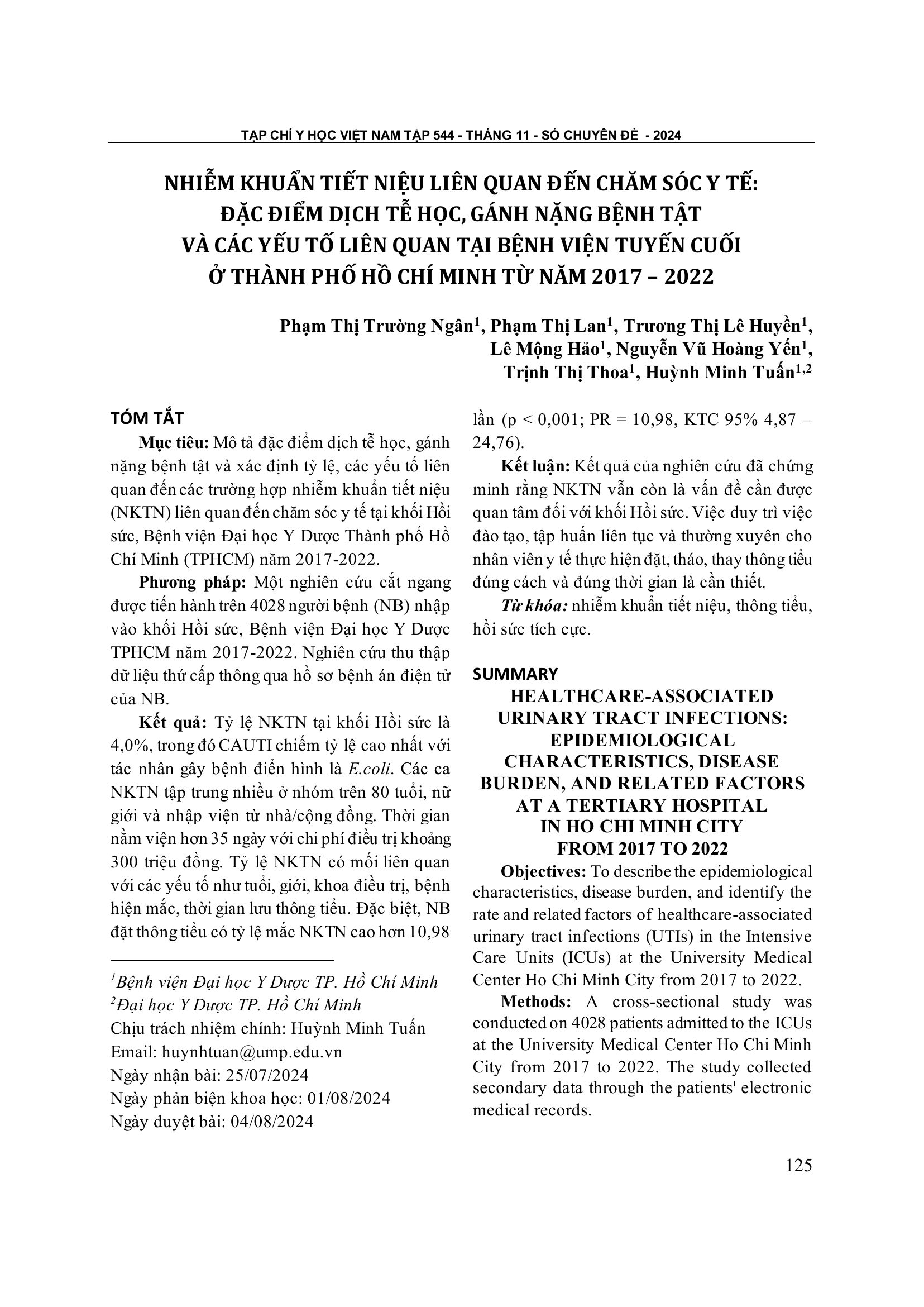Nhiễm khuẩn tiết niệu liên quan đến chăm sóc y tế: Đặc điểm dịch tễ học, gánh nặng bệnh tật và các yếu tố liên quan tại Bệnh viện tuyến cuối ở Thành phố Hồ Chí Minh từ năm 2017 – 2022