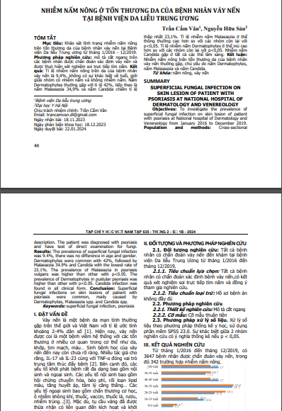 Khảo sát tình trạng nhiễm nấm nông trên tổn thương da của bệnh nhân vảy nến tại Bệnh viện Da liễu Trung ương từ tháng 1/2016 - 12/2019. Phương pháp nghiên cứu: mô tả cắt ngang trên các bệnh nhân được chẩn đoán xác định vảy nến và được thực hiện xét nghiệm soi trực tiếp tìm nấm. Kết quả: Tỉ lệ nhiễm nấm nông trên da của bệnh nhân vảy nến là 9,4%, không có sự khác biệt về tuổi, giới giữa nhóm có nhiễm nấm và không nhiễm nấm.