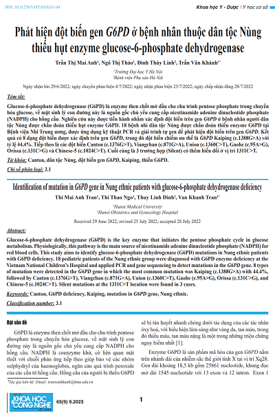 Glucose-6-phosphate dehydrogenase (G6PD) là enzyme then chốt mở đầu cho chu trình pentose phosphate trong chuyển hóa glucose, về mặt sinh lý con đường này là nguồn gốc chủ yếu cung cấp nicotinamide adenine dinucleotide phosphate (NADPH) cho hồng cầu. Nghiên cứu này được tiến hành nhằm xác định đột biến trên gen G6PD ở bệnh nhân người dân tộc Nùng được chẩn đoán thiếu hụt enzyme G6PD.