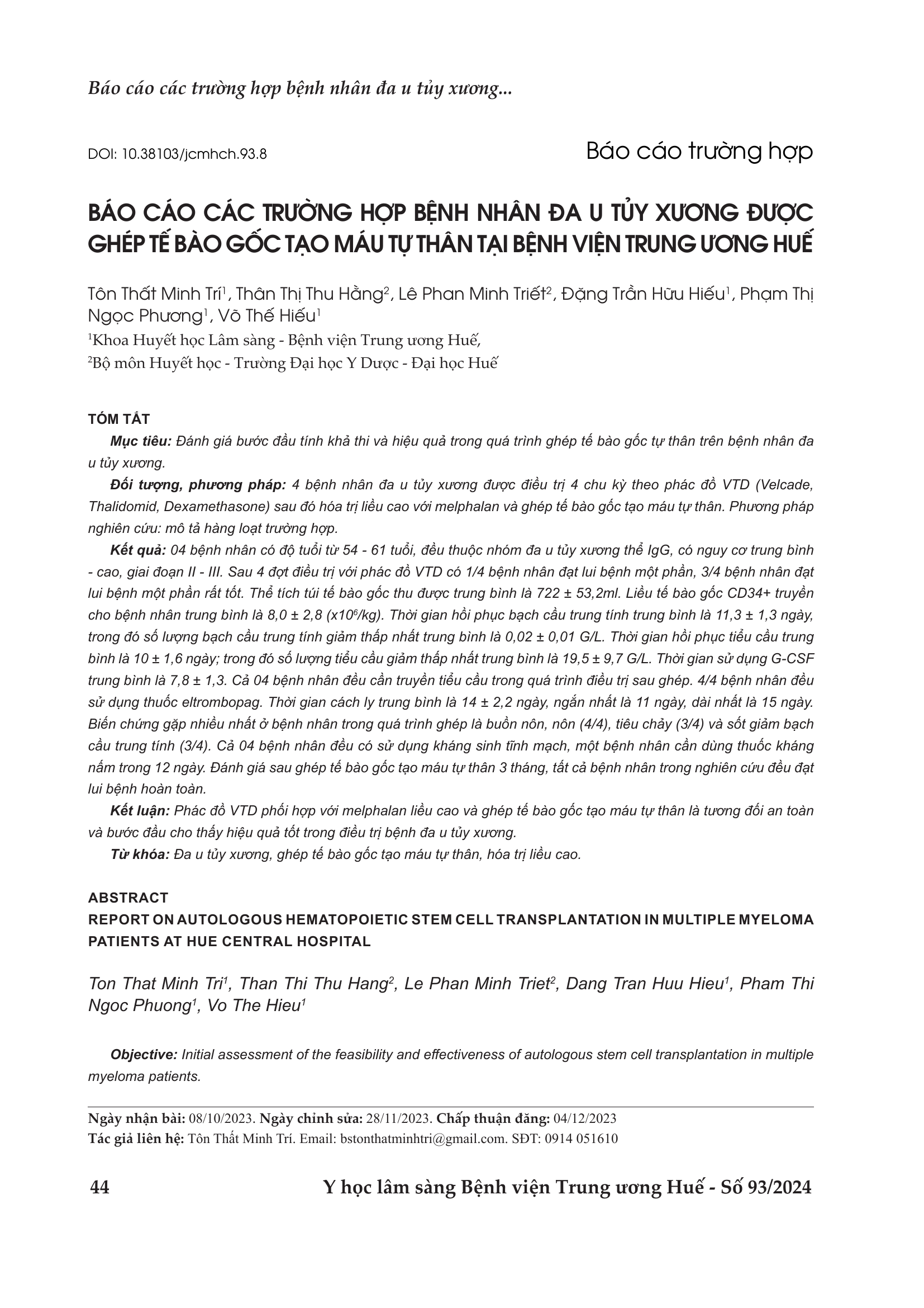 Report on autologous hematopoietic stem cell transplantation in multiple myeloma patients at Hue Central Hospital