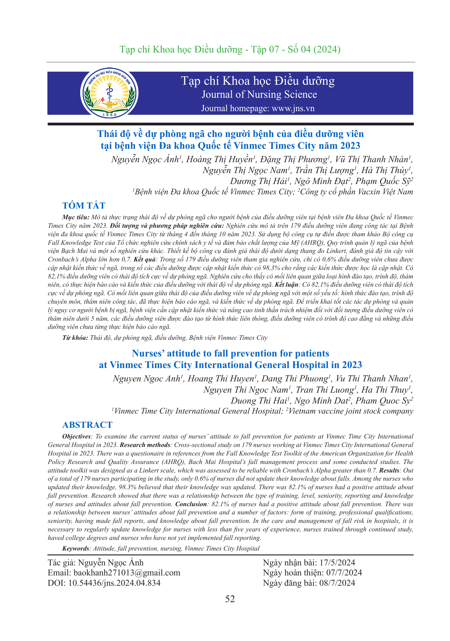 Đối tượng và phương pháp nghiên cứu: Nghiên cứu mô tả trên 179 điều dưỡng viên đang công tác tại Bệnh viện đa khoa quốc tế Vinmec Times City từ tháng 4 đến tháng 10 năm 2023. Sử dụng bộ công cụ tự điền được tham khảo Bộ công cụ Fall Knowledge Test của Tổ chức nghiên cứu chính sách y tế và đảm bảo chất lượng của Mỹ (AHRQ), Quy trình quản lý ngã của bệnh viện Bạch Mai và một số nghiên cứu khác. Thiết kế bộ công cụ đánh giá thái độ dưới dạng thang đo Linkert, đánh giá độ tin cậy với Cronbach’s Alpha lớn hơn 0,7. Kết quả: Trong số 179 điều dưỡng viên tham gia nghiên cứu, chỉ có 0,6% điều dưỡng viên chưa được cập nhật kiến thức về ngã, trong số các điều dưỡng được cập nhật kiến thức có 98,3% cho rằng các kiến thức được học là cập nhật. Có 82,1% điều dưỡng viên có thái độ tích cực về dự phòng ngã. Nghiên cứu cho thấy có mối liên quan giữa loại hình đào tạo, trình độ, thâm niên, có thực hiện báo cáo và kiến thức của điều dưỡng với thái độ về dự phòng ngã. Kết luận: Có 82,1% điều dưỡng viên có thái độ tích cực về dự phòng ngã. Có mối liên quan giữa thái độ của điều dưỡng viên về dự phòng ngã với một số yếu tố: hình thức đào tạo, trình độ chuyên môn, thâm niên công tác, đã thực hiện báo cáo ngã, và kiến thức về dự phòng ngã. Để triển khai tốt các tác dự phòng và quản lý nguy cơ người bệnh bị ngã, bệnh viện cần cập nhật kiến thức và nâng cao tinh thần trách nhiệm đối với đối tượng điều dưỡng viên có thâm niên dưới 5 năm, các điều dưỡng viên được đào tạo từ hình thức liên thông, điều dưỡng viên có trình độ cao đẳng và những điều dưỡng viên chưa từng thực hiện báo cáo ngã