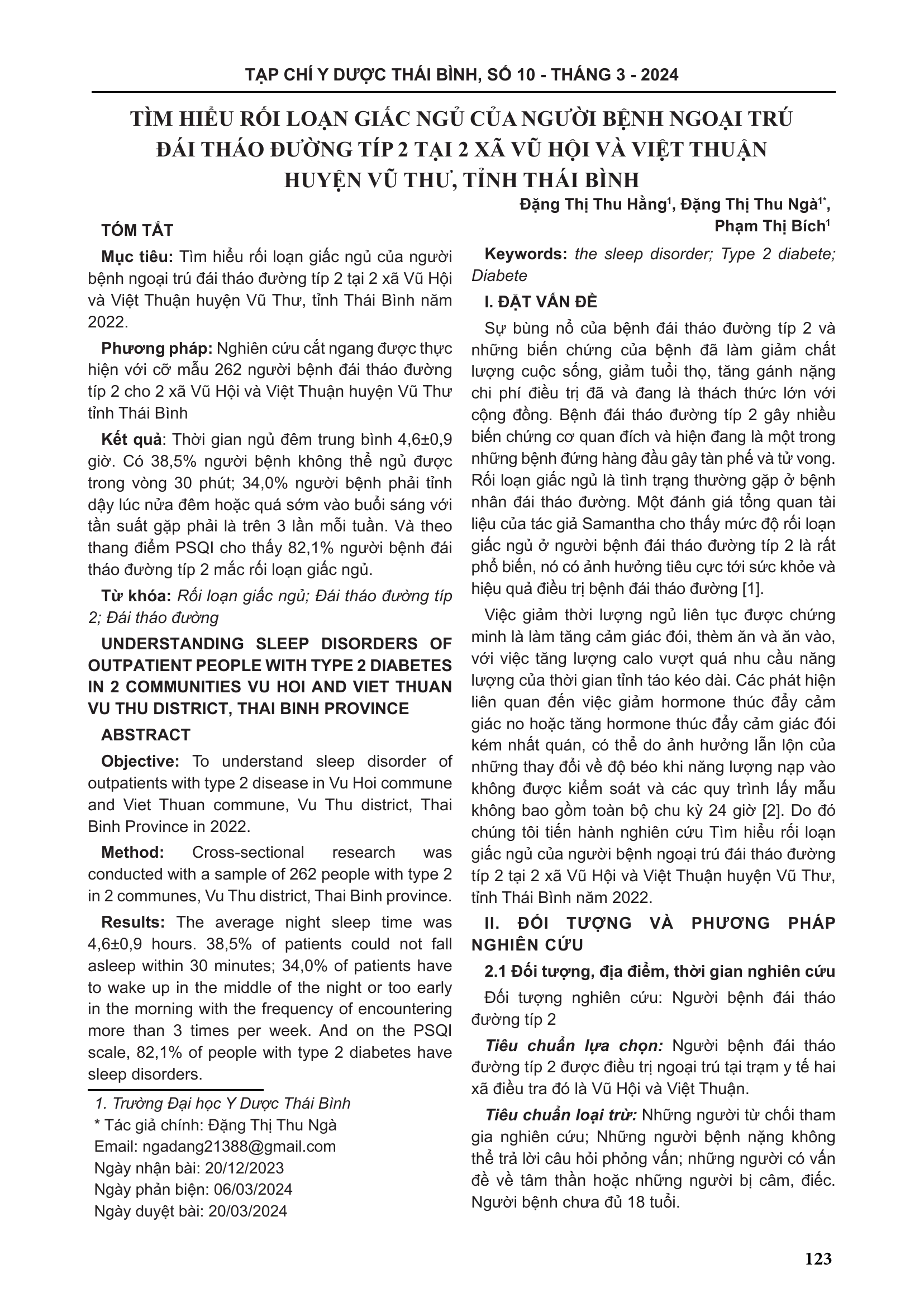Tìm hiểu rối loạn giấc ngủ của người bệnh ngoại trú đái tháo đường Típ 2 tại 2 xã Vũ Hội và Việt Thuận huyện Vũ Thư, tỉnh Thái Bình