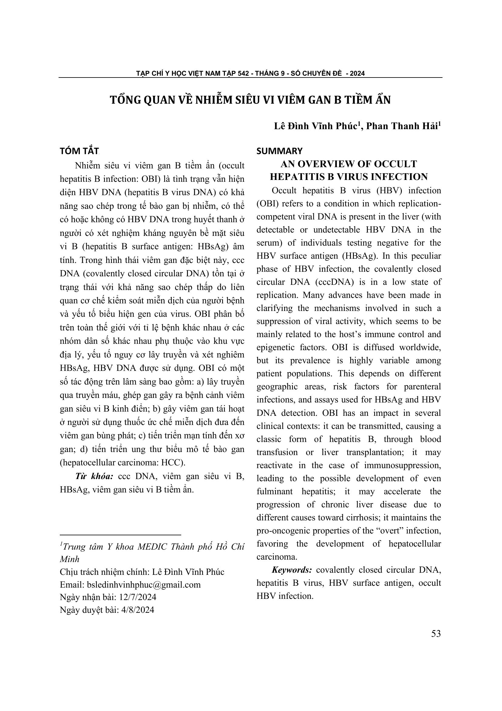 Trong hình thái viêm gan đặc biệt này, ccc DNA (covalently closed circular DNA) tồn tại ở trạng thái với khả năng sao chép thấp do liên quan cơ chế kiểm soát miễn dịch của người bệnh và yếu tố biểu hiện gen của virus. OBI phân bố trên toàn thế giới với tỉ lệ bệnh khác nhau ở các nhóm dân số khác nhau phụ thuộc vào khu vực địa lý, yếu tố nguy cơ lây truyền và xét nghiêm HBsAg, HBV DNA được sử dụng. OBI có một số tác động trên lâm sàng bao gồm: a) lây truyền qua truyền máu, ghép gan gây ra bệnh cảnh viêm gan siêu vi B kinh điển; b) gây viêm gan tái hoạt ở người sử dụng thuốc ức chế miễn dịch đưa đến viêm gan bùng phát; c) tiến triển mạn tính đến xơ gan; d) tiến triển ung thư biểu mô tế bào gan (hepatocellular carcinoma: HCC).